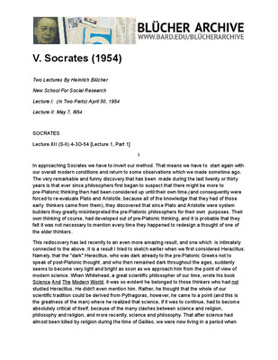 Alexander Bazelow edited these transcripts of two lectures on the philosopher Socrates, delivered by Heinrich Blücher at the New School for Social Research on April 30 and May 7, 1954. The lectures provide a philosophical analysis of Socrates, distinguishing his thought from the subsequent system-building of Plato. Blücher argues that Socrates' true contribution was the discovery of pure philosophy as a universal human capability centered on reason, judgment, and self-inquiry, accessible to all, not just an elite. He contrasts the Socratic ideal of freedom and communal reasoning with Plato's authoritarian response to Socrates' execution. The lectures explore Socrates' method of dialectics, his concept of acknowledging ignorance as the starting point for wisdom, and his belief that happiness is achieved through living in harmony with one's self. Blücher positions Socrates' life and consciously designed death as the ultimate testament to his philosophy, establishing him as a foundational figure for Western thought.