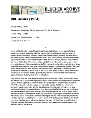 This transcript (edited by Alexander Bazelow) contains two lectures by Heinrich Blücher, delivered at the New School for Social Research in May 1954, presenting a philosophical analysis of Jesus of Nazareth. Blücher argues that when viewed purely as a man, apart from religious belief, Jesus stands as one of history's greatest and most original thinkers. He refutes the characterizations of Jesus by thinkers like Nietzsche and Dostoevsky as an "idiot" or naive idealist, positing instead that Jesus demonstrated a profound understanding of the political and religious conditions of his time.