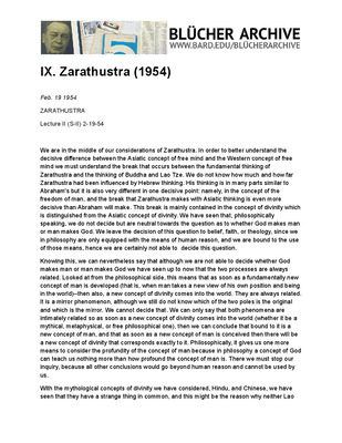 This 1954 lecture transcript (edited by Alexander Bazelow) by Heinrich Blücher continues his analysis of Zarathustra as a decisive turning point between Asiatic and Western conceptions of free mind, reason, and human freedom. Blücher contrasts Zarathustra’s thought with that of Buddha and Lao-Tze, arguing that while all three break with mythological thinking, Zarathustra uniquely articulates a philosophical concept of divinity that establishes clear limits to human reason. Zarathustra’s conception of Ahura-Mazda—understood not as a personal or mythological god but as the abstract “Well-Thinking One”—serves to preserve human freedom by distinguishing absolutely between Creator and creation, thereby preventing both mythological fusion and modern forms of boundless rationalism.