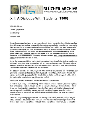 This 1968 lecture, transcript edited by Alexander Bazelow, presents a wide-ranging dialogue between Heinrich Blücher and students addressing the political, moral, and philosophical crises of the modern world. Framed as a midterm discussion, the lecture distinguishes between solvable problems and enduring human conflicts, emphasizing the limits of scientific thinking and the necessity of philosophical mediation. Through examples drawn from mathematics, architecture, politics, art, and classical philosophy, Blücher explores freedom, responsibility, friendship, education, and the formation of personality. Engaging directly with student questions, he defends the Socratic model of philosophizing as a communal, dialogical practice essential for resisting nihilism, ideological thinking, and political violence. The lecture affirms philosophy as an active, lifelong task through which individuals become free, responsible personalities capable of judgment in an unstable world.