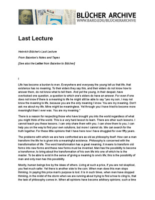 Heinrich Blücher’s Last Lecture, transcript edited by Alexander Bazelow, presents a sweeping philosophical reflection on meaning, freedom, nihilism, and the unfinished task of humanity. Confronting the modern experience of meaninglessness—especially among the young—Blücher argues that philosophy’s enduring task is the transformation of life into meaningful existence through conscious thought and responsible action. He traces the historical development of nihilism and metaphysical belief from ancient myth, through Greek philosophy, Christianity, and modern systems culminating in Hegel, Marx, Kierkegaard, and Nietzsche, whom he treats as prophetic figures of the modern crisis. Blücher criticizes the deification of history, science, power, and ideology, insisting that freedom cannot be imposed by necessity, systems, or commands, but must be lived and chosen by individuals. Drawing on Socrates, Zarathustra, Kant, and Jesus, he defends philosophy as an open, infinite practice rather than a source of absolute answers, and affirms man as the highest value and sole bearer of meaning. The lecture concludes with a call to abandon obsolete ideals of heroes, saints, and geniuses in favor of a renewed commitment to becoming more fully human through questioning, responsibility, and shared pursuit of truth.