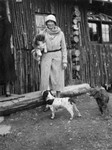 Margaret Kellogg Blodgett, with dogs Chance, Checkers and Gadget, standing in front of the cabin in the woods at the Great Pine Farm estate. This is also the location of the rock called "Simon's Rock" after which the college was named.