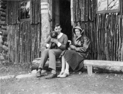 Elizabeth (Betty) and Livingston (Livy) Hall sitting in front of the cabin in the woods of the Great Pine Farm estate belonging to Betty's parents, Margaret and Thomas Blodgett. This is also the location of the rock called "Simon's Rock" after which the college was named.